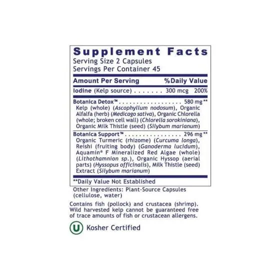 - Kelp (whole) (Ascophyllum nodosum), Organic Alfalfa (herb) (Medicago sativa), Organic Chlorella (whole; broken cell wall) (Chlorella sorokiniana), Organic Milk Thistle (seed) (Silybum marianum)