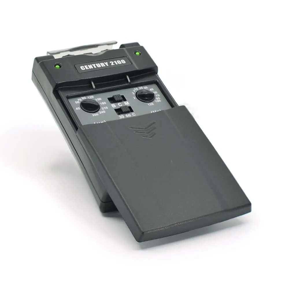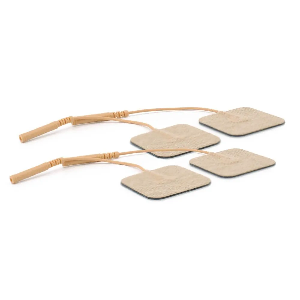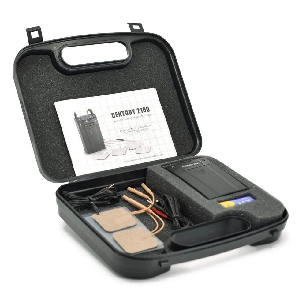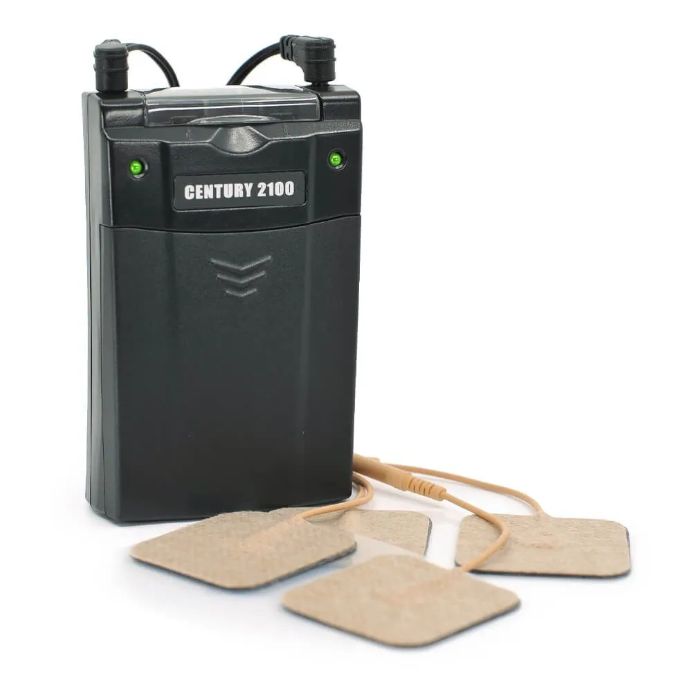 Full featured, high quality, dual channel, constant current TENS. Features 3 frequency settings: (C) continuous adjustable frequency from 2 to 160 Hz, (M) pulse width modulation, and (B) burst mode. Includes self-adhesive electrodes (1.5" x 1.5") with wires, carrying case, belt clip, 9 volt battery, and instructions.