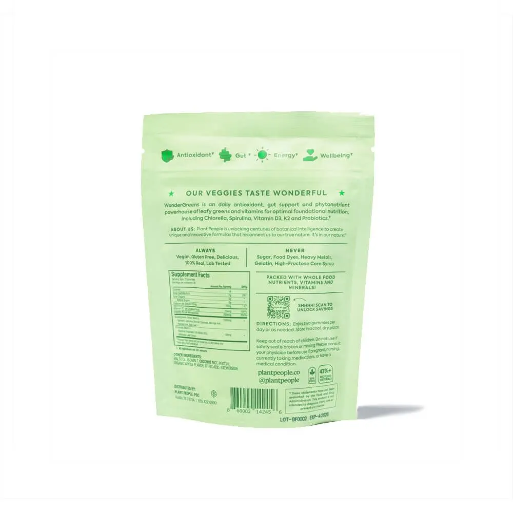 Get your greens in a great-tasting gummy with Plant People WonderGreens Veggie Gummies. These gummies are formulated to support nutrition, energy levels, immune function, gut health, and overall well-being. They contain vitamins D3 and K2, blends of nutrient-dense superfood greens and pre- and probiotics, and feature a delicious, chef-crafted green apple flavor. They are lab-tested, vegan, non-GMO, gluten-free, and contain no sugar, corn syrup, dyes, or gelatin. Available in pouches of 60 gummies.