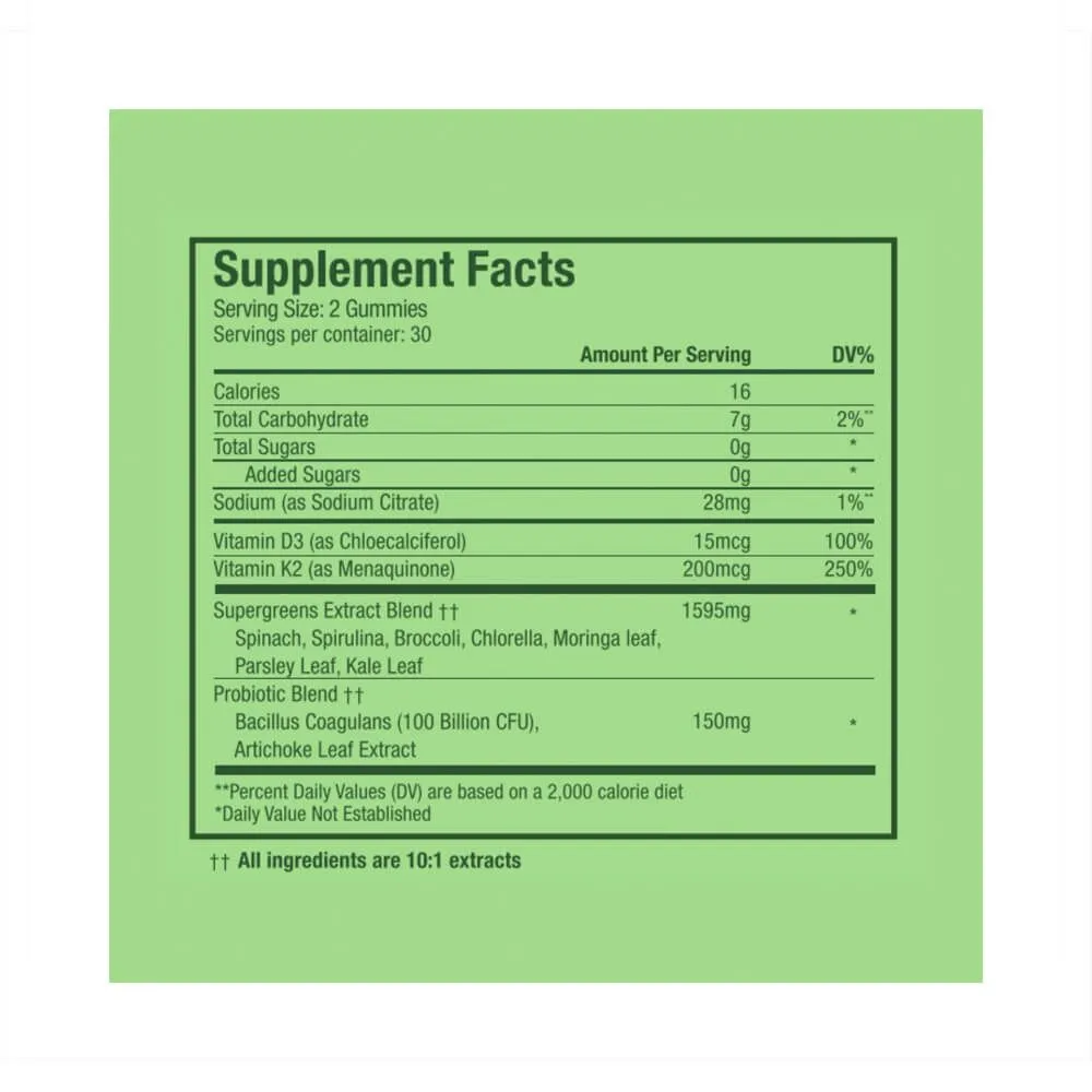 Active Ingredients: Supergreens Extract Blend (1595mg): Spinach, Spirulina, Broccoli, Chlorella, Moringa Leaf, Parsley Leaf, Kale Leaf, Vitamin D3 (15mcg), Vitamin K2 (200mcg). Probiotic Blend (150mg): Bacillus Coagulans (100 Billion CFU), Artichoke Leaf Blend (Prebiotic)