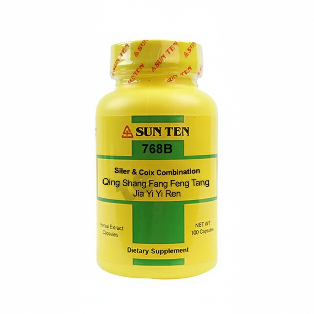 Ingredients: Fang-feng root (fang feng), Gardenia fruit (zhi zi), Mentha herb (bo he), Bitter orange fruit (zhi shi), Schizonepeta herb (jing jie), Coptis root (huang lian), Scute root (huang qin), Platycodon root (jie geng), Forsythia fruit (lian qiao), Fragrant Angelica (bai zhi), Cnidium root (chuan xiong), Coix seed (yi yi ren), Chinese licorice root (gan cao).