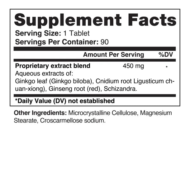 Ingredients: Ginkgo leaf (Ginkgo biloba), Cnidium root (Ligusticum chuan-xiong), ginseng root (red), Schizandra.