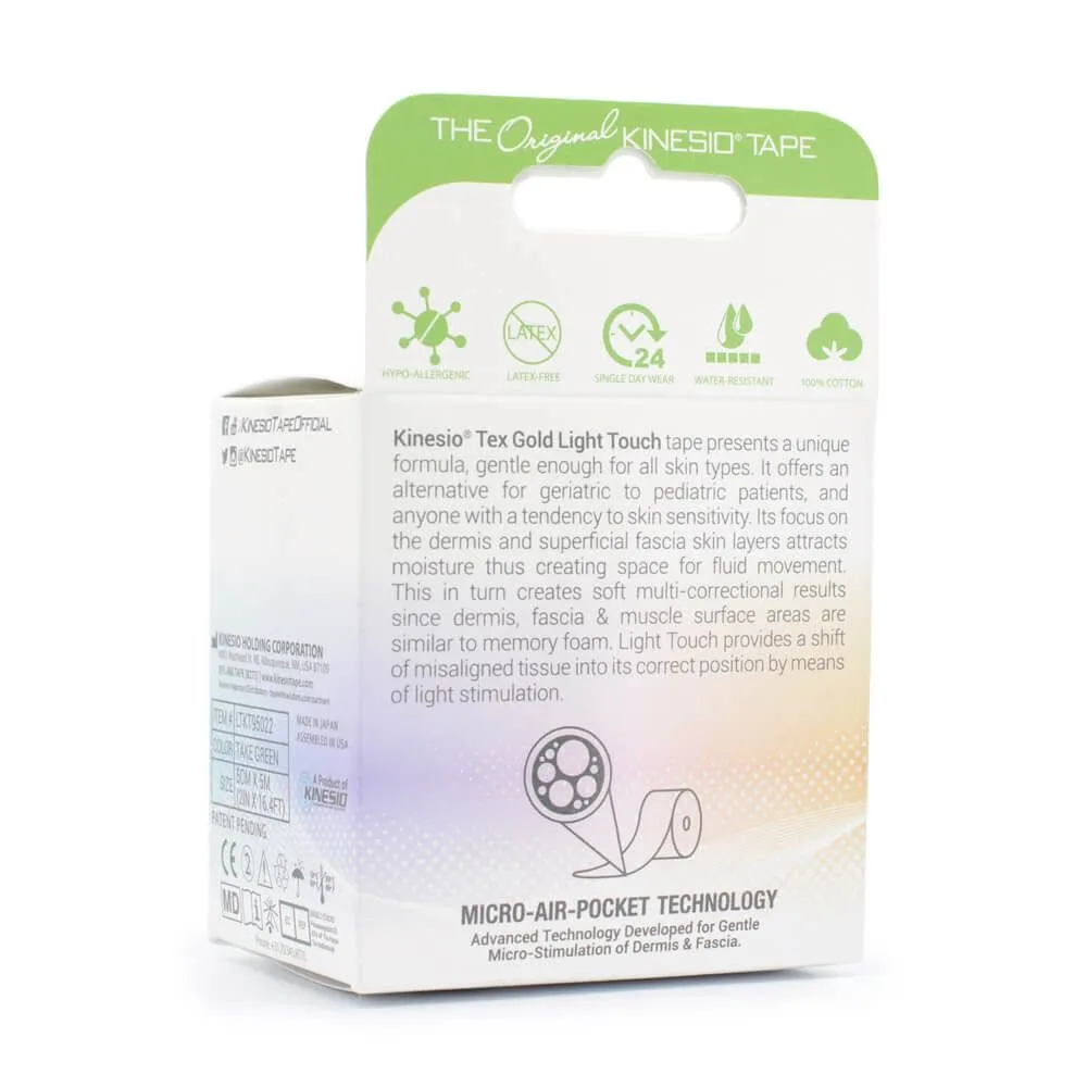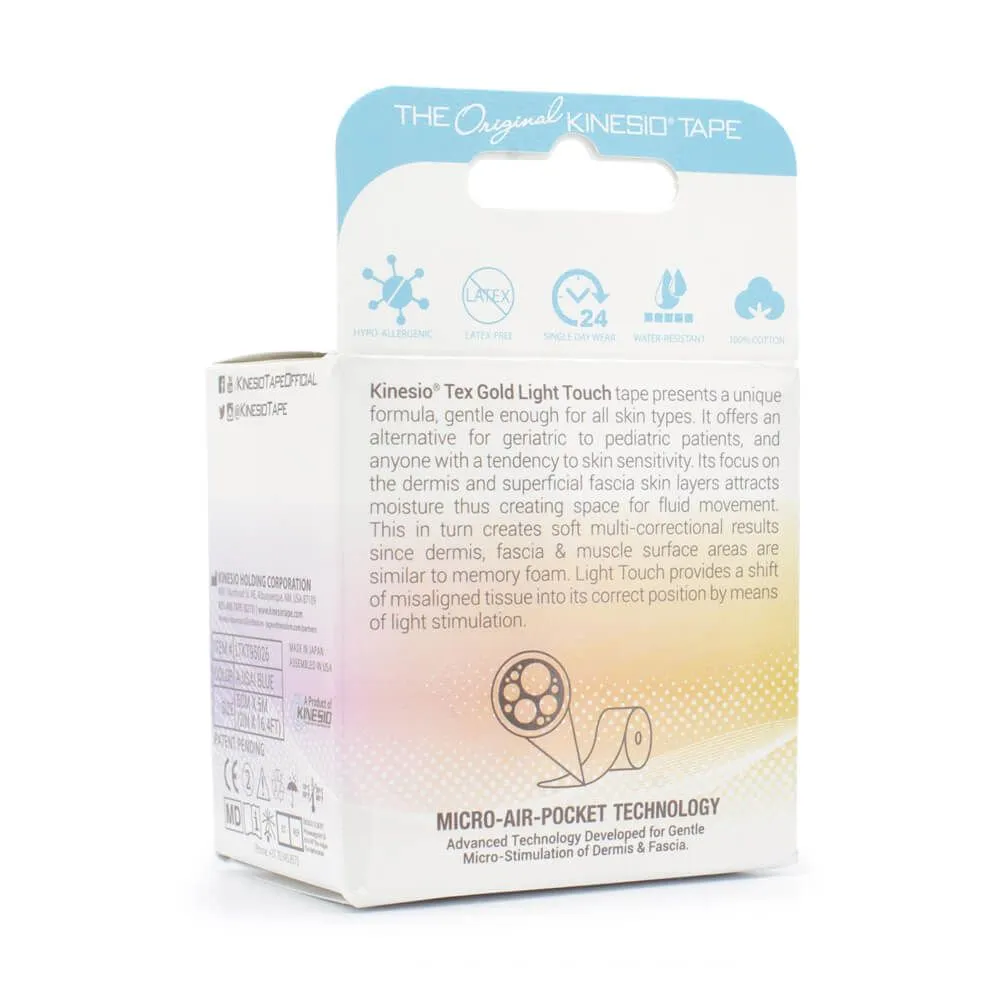 Kinesio Tex Gold Light Touch tape features a unique formula that is gentle enough for all skin types. It offers an alternative for geriatric or pediatric patients or anyone with sensitive skin by utilizing micro-air-pocket technology to provide micro-stimulation of the epidermis, dermis, and fascia that shifts misaligned tissue into its correct position. Available in three pastel colors: blue, green, and purple.