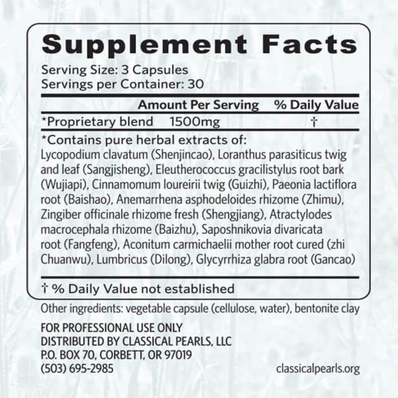 Bamboo Pearls by Classical Pearls is inspired by the 2nd century formula Guizhi Shaoyao Zhimu Tang, originally documented in Zhang Zhongjing’s Essentials from the Golden Cabinet (Jingui yaolüe). From a traditional Chinese medicine perspective, the blend of cinnamon, ginger, and a moderate dose of aconite works to open blocked channels, dispel dampness, and expel wind. Peony, particularly when paired with cinnamon and aconite, helps alleviate pain, cramping, tingling, and numbness. When combined with anemarrhena, a cooling herb, peony also addresses localized heat and congestion.