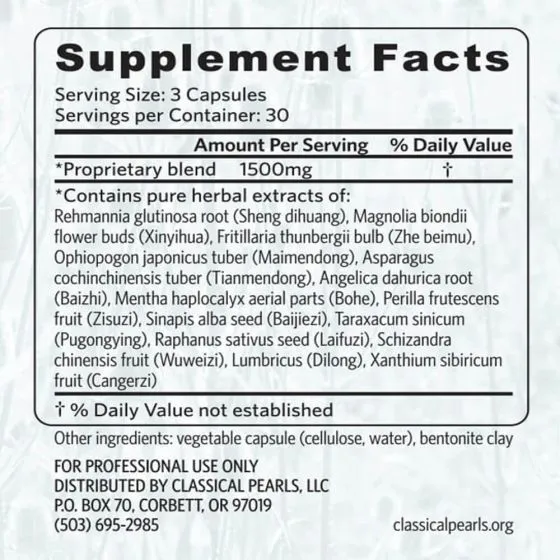 Classical Pearls Wind Pearls is designed to address respiratory issues caused by environmental allergies. Its complex formulation draws inspiration from the well-known remedy for nasal ailments, Cangerzi San (Xanthium Powder), which effectively expels wind and opens the nasal passages. The formula also incorporates Sanzi Yangqin Tang (Three-Seed Decoction to Nourish One’s Parents), a 16th-century asthma treatment that aids in the descent and transformation of phlegm. A blend of moistening ingredients helps soothe chronically inflamed mucous membranes by nurturing the yin of the Lung and Kidney. Dandelion alleviates stagnant heat and hidden toxicity, while lumbricus promotes the opening of congested channels. Together, these components create a holistic approach to managing autoimmune conditions affecting the respiratory tract's mucous membranes.